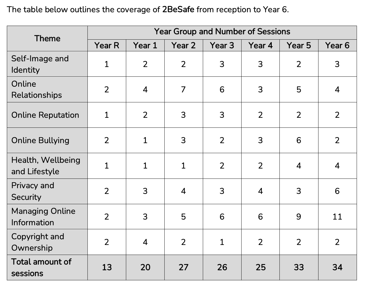 Online safety is central to everything we do in Computing. Pupils learn how to stay safe, respectful and responsible online through regular teaching and revisiting key messages throughout the year using 2BeSafe.